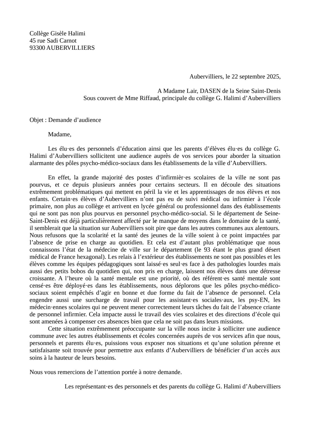 Vous êtes ici : Accueil actu des établissements Seine-Saint-Denis Situation préoccupante des pôles psycho-médico-sociaux à Aubervilliers 24 septembre 2025 actu des établissements Situation préoccupante des pôles psycho-médico-sociaux à Aubervilliers Courrier à la DSDEN 93 des personnels du collège G. Halimi d’Aubervilliers.