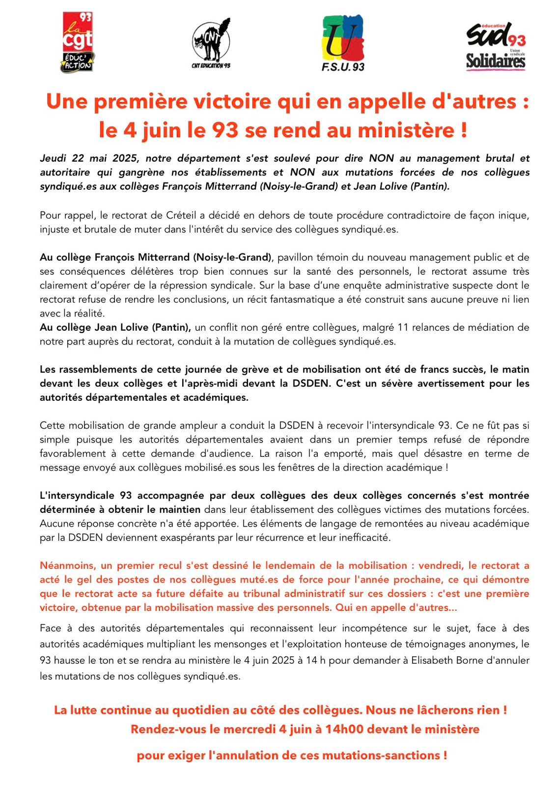 Vous êtes ici : Accueil actu des établissements Seine-Saint-Denis Une première victoire qui en appelle d’autres : le 4 juin, le 93 se rend au ministère ! 26 mai 2025 actu des établissements Une première victoire qui en appelle d’autres : le 4 juin, le 93 se rend au ministère ! Communiqué de l’intersyndicale 93 du 26 mai 2025.